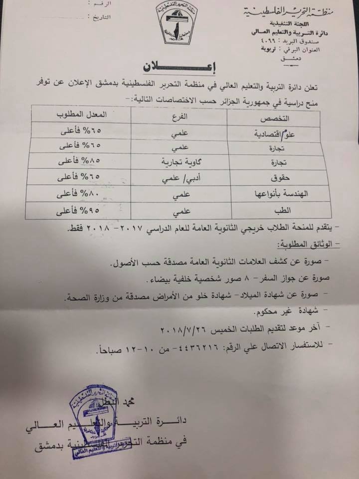 كشفت دائرة التربية والتعليم العالي في " منظمة التحرير الفلسطينية" بدمشق، عن توّفر منح دراسيّة مقدمة من الحكومة الجزائرية لطلبة فلسطين اللاجئين في سوريا، داعية الطلّاب المهتمّين للتسجيل في مهلة أقصاها يوم الخميس المقبل 26 تمّوز/ يوليو.