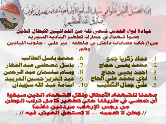 ونعى اللواء عبر حسابه الرسمي على موقع التواصل الاجتماعي "فيس بوك" يوم، 14 نيسان/ ابريل الجاري، قضاء كل من عماد زكريا جمو، محمد يحيى حجاج، أحمد يحيى حجاج، لؤي محمد علي الحاج، علي جمال الكطيب، محمد باسل الطالب، باسل مصطفى عبد القهار، وسام سليمان عبد الرحمن، عبد العزيز حسين العربيد، أسامة عبد الله سويدان، وذلك أثناء المواجهات التي اندلعت مع تنظيم داعش في منطقة بير علي جنوبي الميادين.