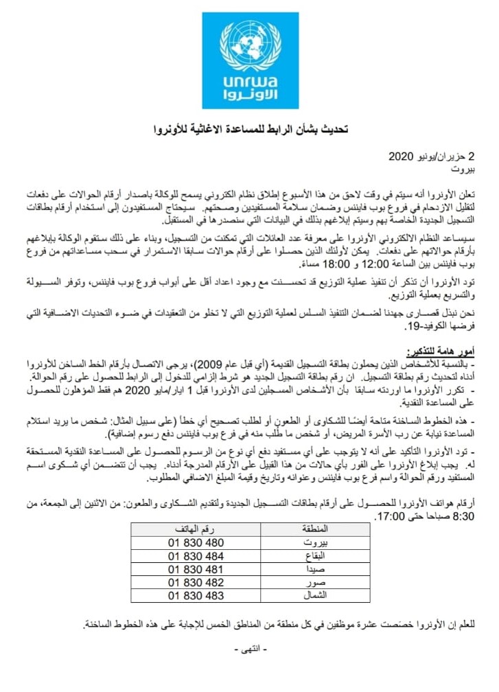وأرفقت الأونروا البيان بأرقام هاتف ساخنة لتحديث بيانات بطاقة التسجيل القديمة الممنوحة قبل 2009 مؤكدة أن رقم بطاقة التسجيل الجديد هو شرط إلزامي للدخول إلى الرابط للحصول على رقم الحوالة، وبأن الأشخاص المسجلين لدى الأونروا قبل 1 ايار/مايو 2020 هم فقط المؤهلون للحصول على المساعدة النقدية.