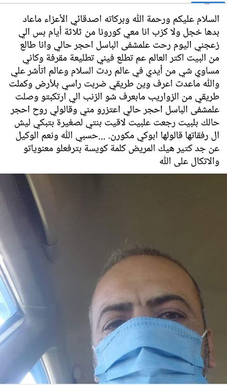 الناطور كتب عبر صفحته عل موقع التواصل الاجتماعي (الفيس بوك)، أصدقائي الأعزاء ما عاد بدها خجل ولا كذب أنا معي كورونا من ثلاثة أيام، واليوم قررت أذهب إلى مشفى الباسل كي أخضع للحجر الصحي، لكن الذي زعجني وأثر في نفسي أنني عندما اطلعت من منزلي شفت أكثر الناس تنظر إلى نظرة مقرفة وكأنني مرتكب ذنب أو عار، مضيفاً أنني عندما ألقيت التحية على بعض الأشخاص منهم من رد التحية وبعضهم أشاح بوجه عني، والبعض الآخر بدأ يتهامس ويشير إلي وكأنني أنا من جلبت المرض لنفسي.