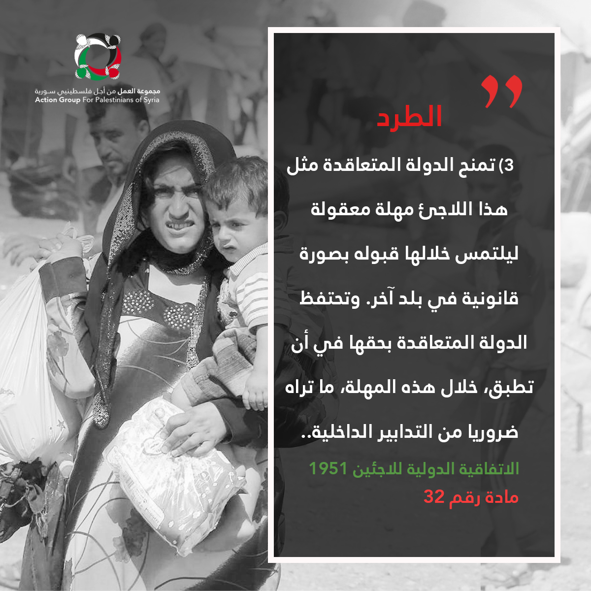 لا ينفذ طرد مثل هذا اللاجئ إلا تطبيقا لقرار متخذ وفقا للأصول الإجرائية التي ينص عليها القانون. ويجب أن يسمح للاجئ ما لم تتطلب خلاف ذلك أسباب قاهرة تتصل بالأمن الوطني، بأن يقدم بينات لإثبات براءته، وبأن يمارس حق الاستئناف ويكون له وكيل يمثله لهذا الغرض أمام سلطة مختصة أو أمام شخص أو أكثر معينين خصيصا من قبل السلطة المختصة.