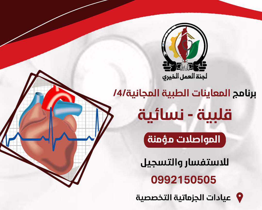 وذكرت الجمعية في الإعلان الذي نشرته على صفحتها الرسمية في موقع التواصل الاجتماعي الفيس بوك أن برنامج الحملة سيشمل المعاينات المجانية في عيادتي القلبية والنسائية بمركز (العيادات التخصصية) بمنطقة الجزماتية في العاصمة السورية دمشق.