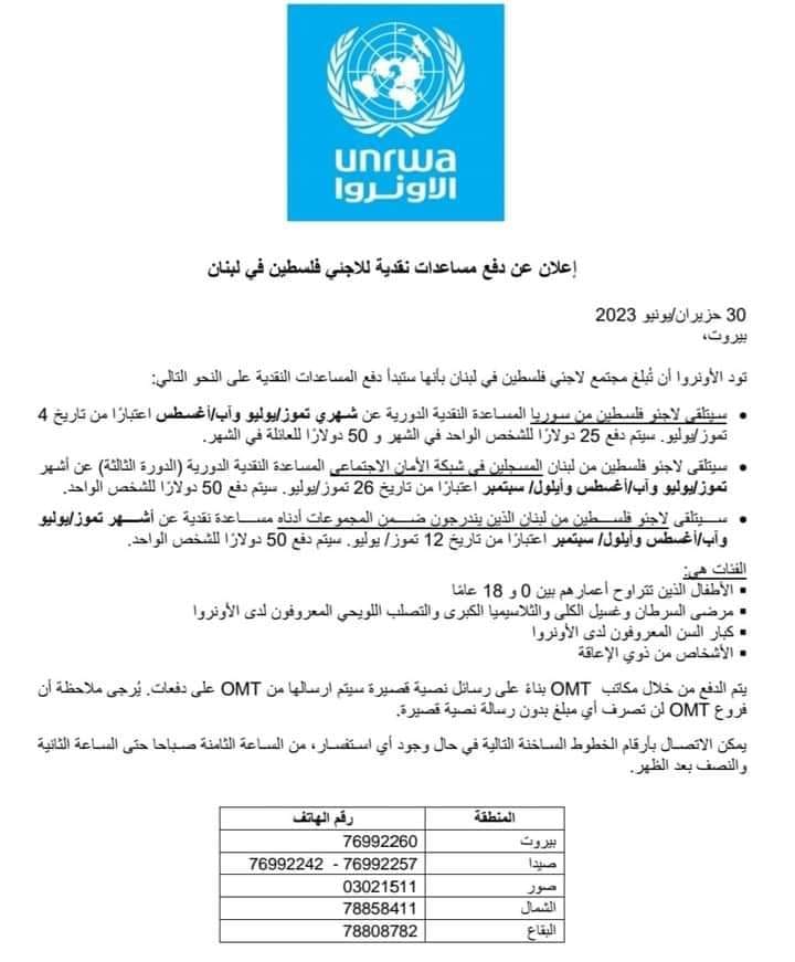 أعلنت وكالة غوث وتشغيل اللاجئين الفلسطينيين (أونروا) أنها ستبدأ في الرابع من تموز / يوليو الحالي دفع المساعدة النقدية الدورية لعائلات لاجئي فلسطين من سوريا عن شهري تموز / يوليو، وآب / أغسطس 2023.