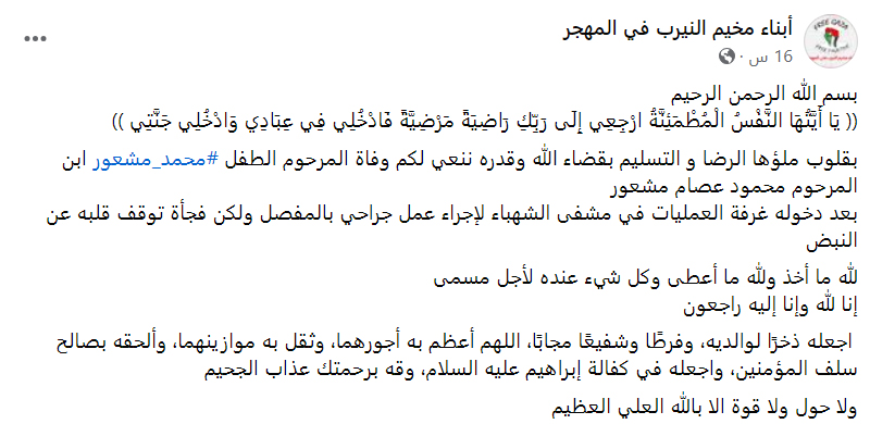 وذكرت إحدى صفحات مواقع التواصل الاجتماعي (فيس بوك) المعنية بنقل أخبار مخيم النيرب، أن الطفل محمد دخل إلى مشفى "الشهباء" لإجراء عمل جراحي بالمفصل نتيجة إصابته بشظية سابقة تحركت داخل جسده، وبعد دخوله إلى غرفة العمليات فجأة انخفض خضاب الدم لدى الطفل للصفر، وتوقف قلبه عن النبض وتم ادخاله لغرفة العناية المركزة، وبعد ذلك أعلن الأطباء عن وفاته.