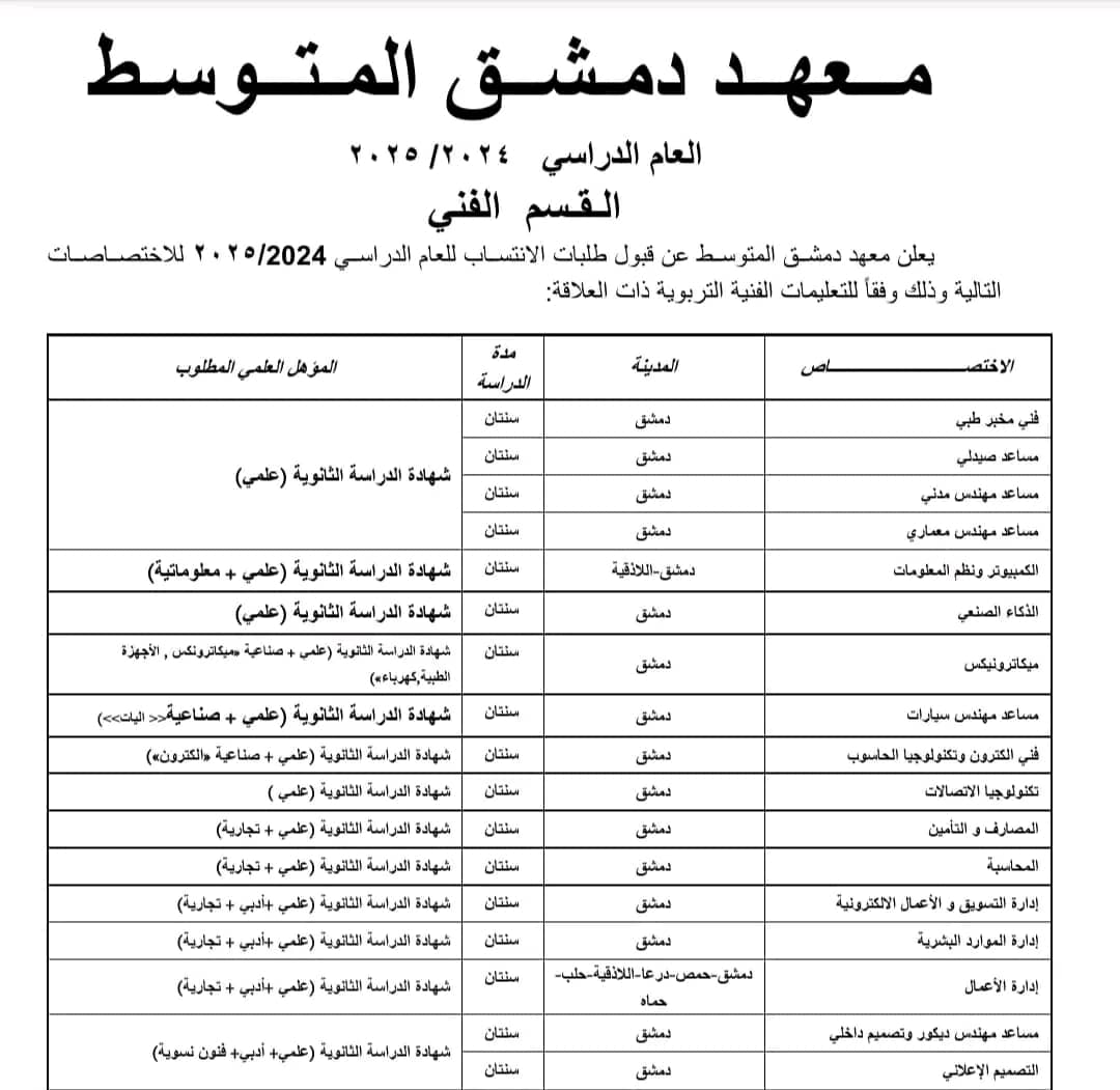 أعلن معهد دمشق المتوسط عن قبول طلبات الانتساب للعام الدراسي 2024/2025 في اختصاصات الإدارة وفقًا للتعليمات الفنية التربوية ذات العلاقة.