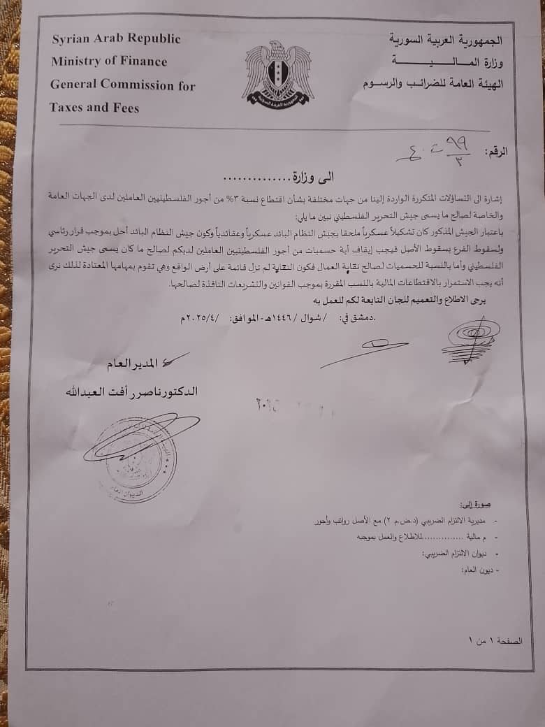 أصدرت الهيئة العامة للضرائب والرسوم السورية تعميماً رسمياً يقضي بوقف اقتطاع نسبة 3% من أجور العمال الفلسطينيين في القطاعين العام والخاص، والتي كانت تُحوَّل سابقاً لصالح "جيش التحرير الفلسطيني".