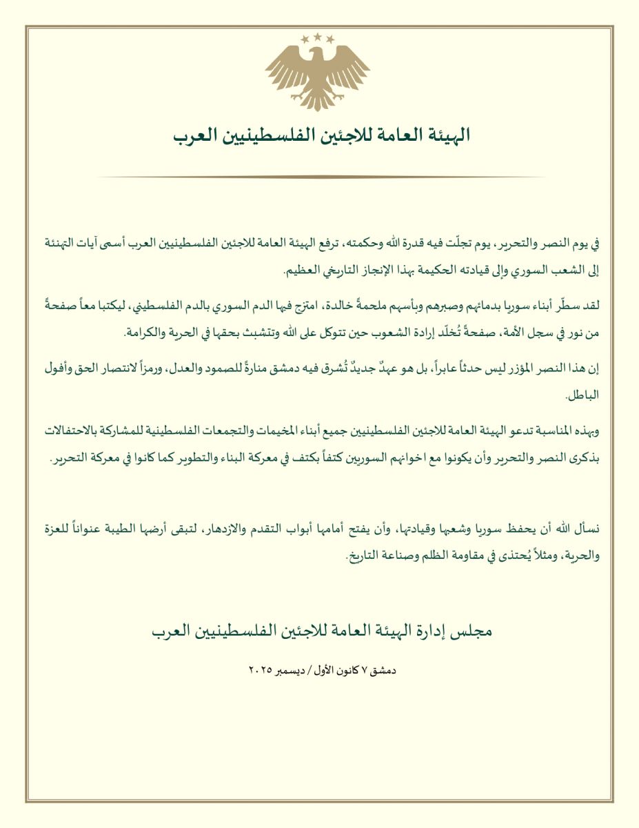 أصدرت الهيئة العامة للاجئين الفلسطينيين العرب بياناً رسمياً بمناسبة "يوم النصر والتحرير"، واصفة إياه بـ "الإنجاز التاريخي العظيم" الذي سطّره الشعب السوري بدمائه وصبره، حيث "امتزج الدم السوري بالفلسطيني" في ملحمة خالدة تخلّد إرادة الشعوب الحرة.