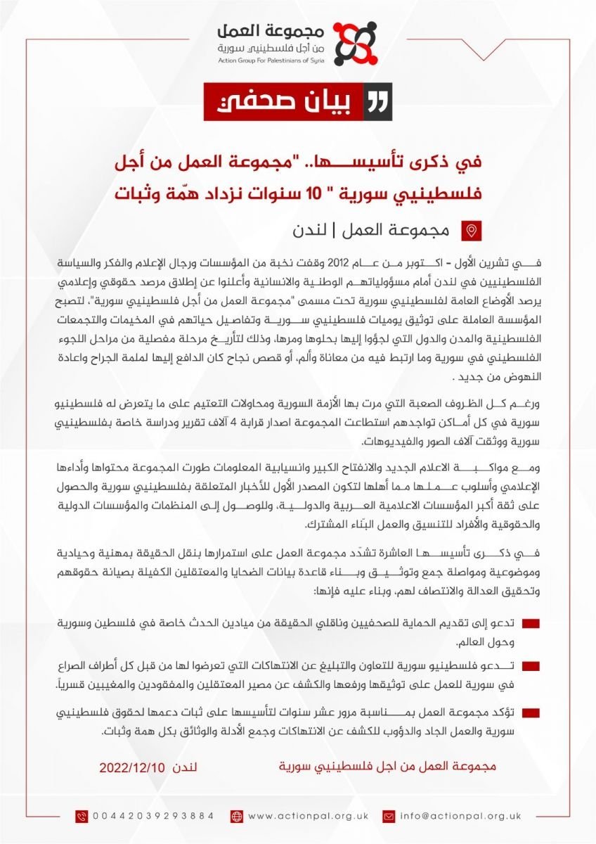 • تؤكد مجموعة العمل بمناسبة مرور عشر سنوات لتأسيسها على ثبات دعمها لحقوق فلسطينيي سورية والعمل الجاد والدؤوب للكشف عن الانتهاكات وجمع الأدلة والوثائق بكل همة وثبات.