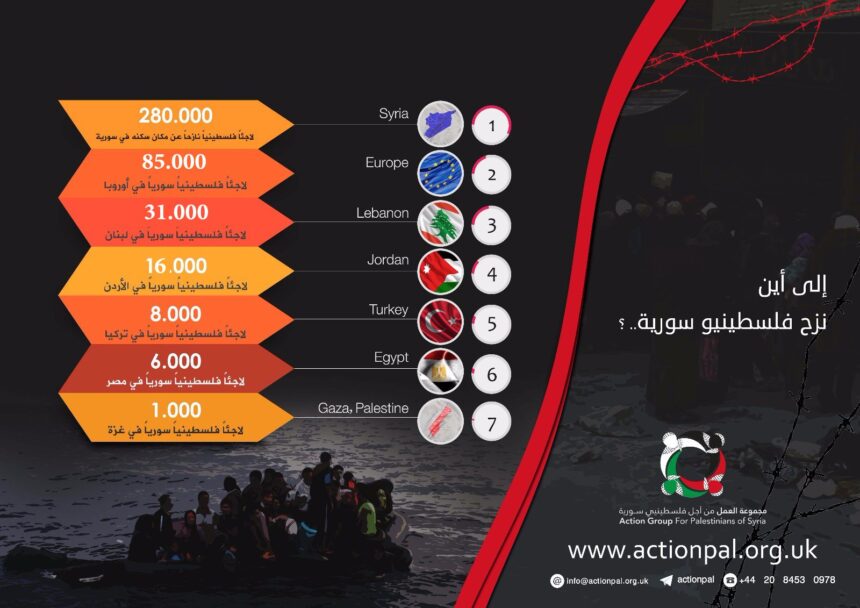 وأكد قسم الدراسات إلى أن أكثر من (85) ألف لاجئ فلسطيني سوري وصلوا إلى أوروبا حتى نهاية 2016، في حين يقدر عدد اللاجئين الفلسطينيين في لبنان بحوالي (31) ألف، وفي الأردن (17) ألف، وفي مصر (6) آلاف، وفي تركيا (8) آلاف، وفي غزة ألف فلسطينيي سوري.