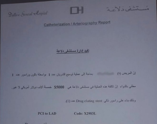 المريضة تناشد أصحاب الأيادي البيضاء وكل من يستطيع تقديم العون لمساعدتها في تأمين تكاليف إجراء عملية توسيع للشرايين عدد 1 بواسطة بالون عدد 1، وراسور عدد 2 التي تصل إلى حوالي 5 آلاف $، ستقدم منهم الأونروا 2000$ وبقي من المبلغ المستحق ما يقارب 30200$.