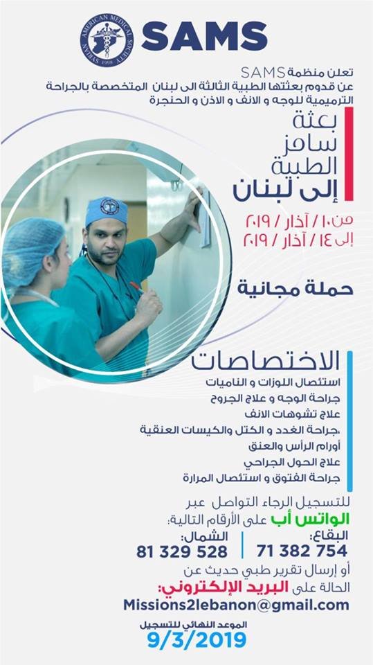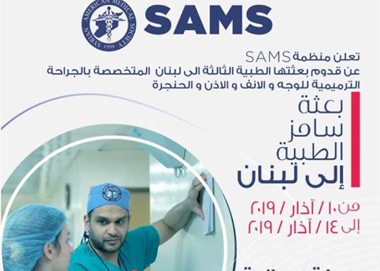أعلنت منظمة سامز عن قدوم بعثتها الطبية الثالثة إلى لبنان، المتخصصة بالجراحة الترميمية للوجه والأنف والأذن والحنجرة من 10 إلى 14 أذار، مشيرة إلى أن حملتها الطبية مجانية.