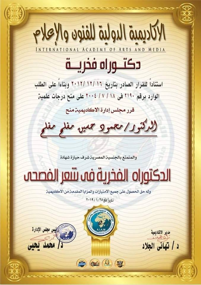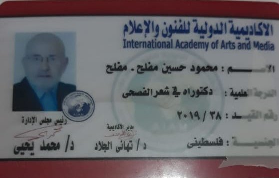 مَنحتْ الأكاديمية الدولية للفنون والاعلام في مصر شهادة الدّكتوراة الفخريّة للأديب والكاتب الفلسطينيّ محمود حسين مفلح في شعر الفصحى.