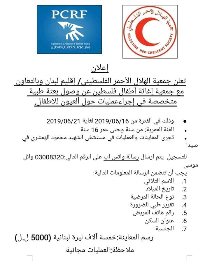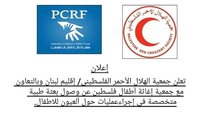 أعلنت جمعية الهلال الأحمر الفلسطيني إقليم لبنان بالتعاون مع جمعية إغاثة أطفال فلسطين عن وصول بعثة طبية متخصصة في إجراء عمليات العين للأطفال من عمر عام واحد إلى 16 عاماً، في الفترة بين 16- 21 الشهر الحالي.