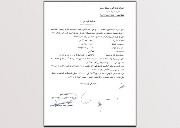 أعلنت الشركة العامة لكهرباء محافظة دمشق يوم 24/9/2019 عن مناقصة لتلزيم أعمال الحفريات الطارئة و استبدال الكابلات الأرضية المعطوبة و التخفيف عن الكابلات ذات الحمولة الزائدة في المناطق التابعة لقسم اليرموك وفقاً لدفاتر الشروط الفنية و الحقوقية و المالية المعدة بهذا الخصوص.