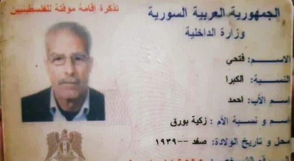 ونشر الكاهن حزوري على صفحته على “فيس يوك” البطاقة الشخصية للاجئ ويدعى “فتحي الكبرا” والده أحمد ووالدته زكية بورق، وهو من مواليد صفد عام 1939.