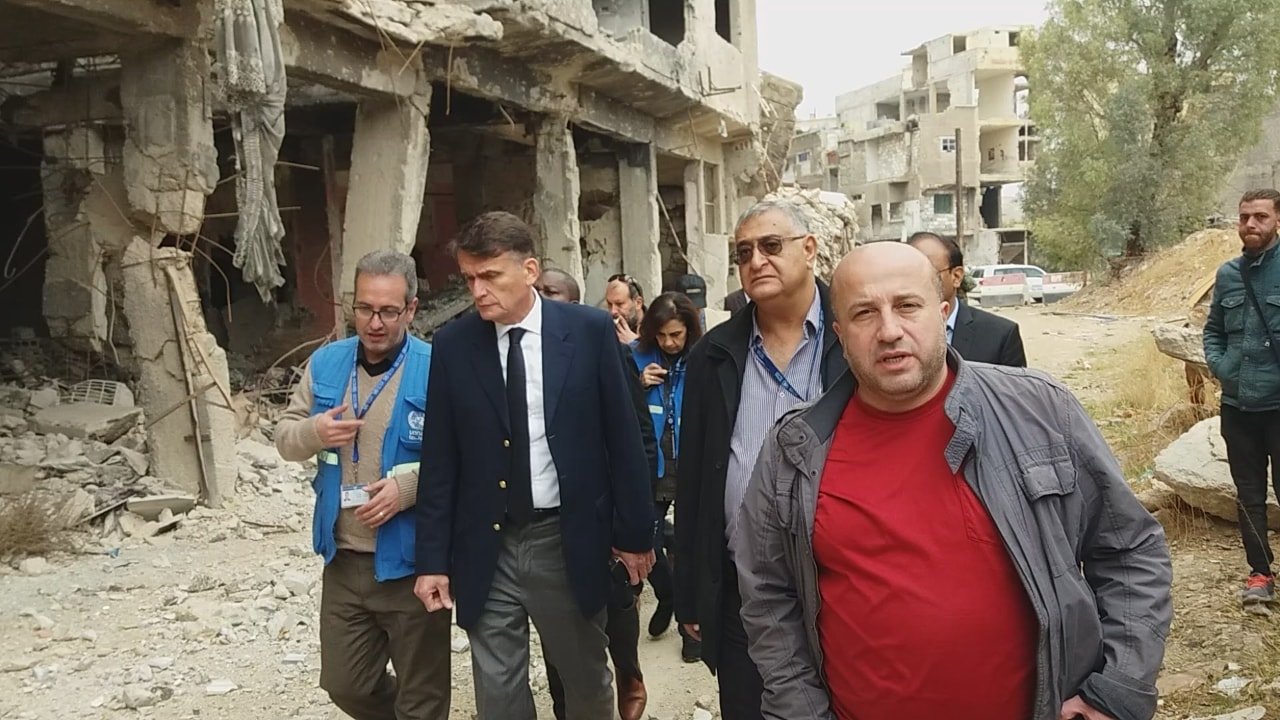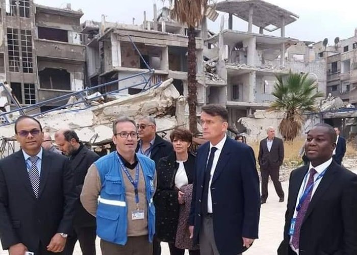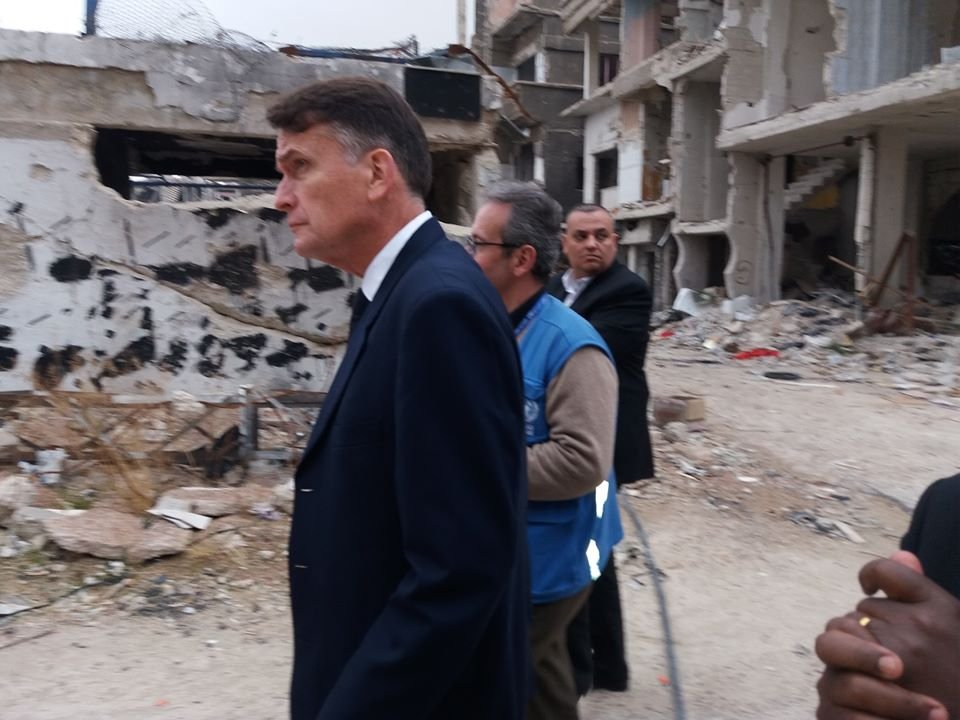 زار القائم بأعمال المفوض العام لوكالة غوث وتشغيل اللاجئين الفلسطينيين في الشرق الأدنى (الأونروا) كريستيان ساوندرز ووفد من الهيئة العامة للاجئين الفلسطينيين مخيم اليرموك للاجئين الفلسطينيين جنوب العاصمة السورية دمشق يوم أمس الخميس 5 كانون الأول/ ديسمبر، بهدف الاطلاع على حجم الدمار الذي تعرض له مخيم اليرموك، والأضرار التي لحقت بمدارس ومنشآت وكالة الغوث.