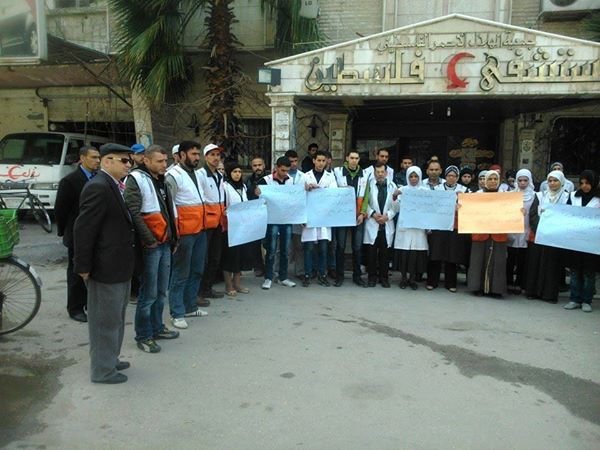نفّذ عدد من كوادر ومتطوعي جمعية الهلال الأحمر الفلسطيني في مخيم اليرموك اليوم وقفة تضامنية، وذلك احتجاجاً على استهداف الكوادر والطواقم الطبية في المخيم، كما عبروا عن ادانتهم لاغتيال الناشط الإغاثي والطبي” يحيى عبد الله الحوراني” الذي اغتيل بطلق ناري أثناء يوم أمس أثناء توجهه إلى مشفى فلسطين.