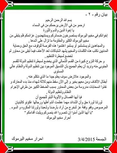 أصدر أحرار وثوار مخيم اليرموك بيانهم الثاني وجهوا من خلاله نداء استغاثة يستصرخون فيه ضمائر كافة الأطراف والكتائب المسلحة الغيورة على عدم استباحة المخيم من قبل تنظيم الدولة”داعش” وجبهة النصرة، ويطالبونهم بالتدخل ومؤازرة وانقاذ ما تبقى المخيم، كما شدد البيان على أن المجاهدين لن يستسلموا أو يسلموا وما زالوا يقاتلون بكل ما استطاعوا من قوة، كما دعا البيان تلك الفصائل إلى اغتنام الفرصة للوقوف مع الحق وحماية المدنيين، فيما أشار البيان إلى أن هناك حركة نزوح كبيرة من القسم الشمالي الذي يخضع لسيطرة”داعش” للقسم الجنوبي منه، ونوه البيان بأن هناك تنسيق كبير بين تنظيم “داعش” وقوات النظام السوري على الأرض.