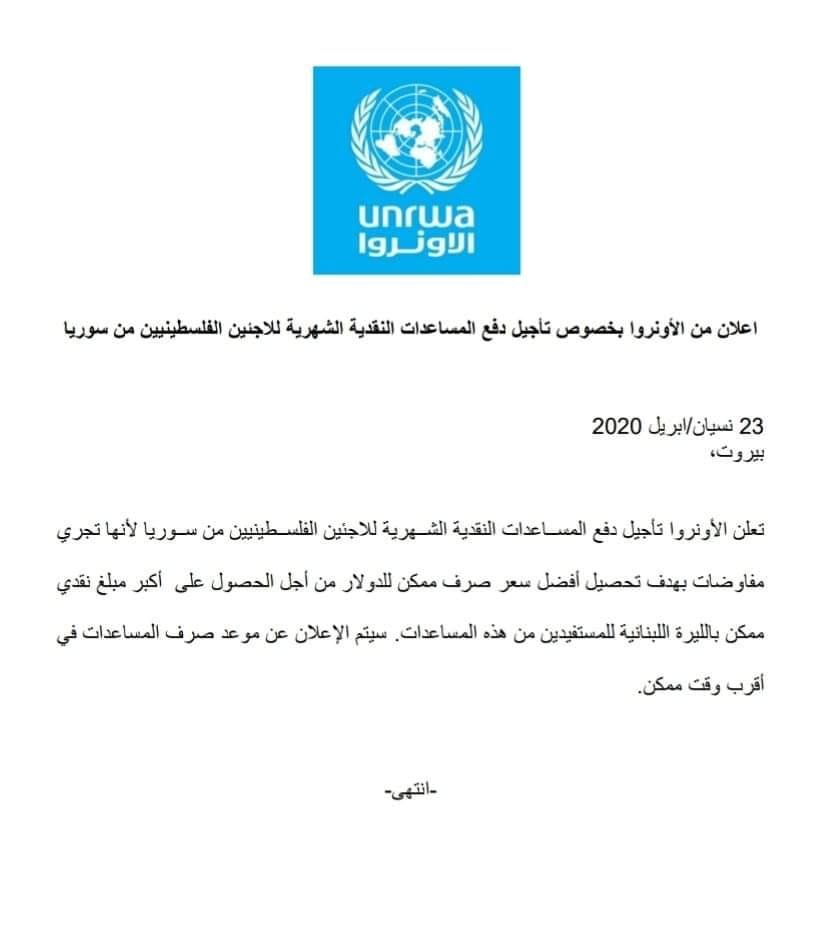 أعلنت وكالة الأونروا في لبنان تأجيل دفع المساعدات النقدية الشهرية للاجئين الفلسطينيين من سورية، على الرغم من الأوضاع المعيشية السيئة التي يعيشها الفلسطينيون والمناشدات المستمرة.