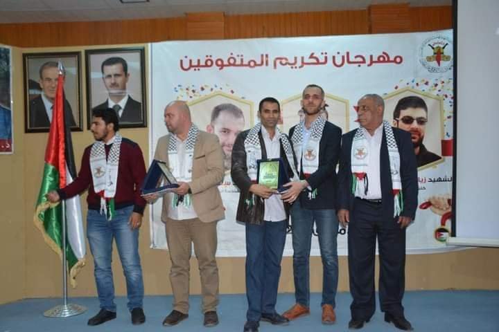 نظمت حركة الجهاد الإسلامي بالمركز الثقافي العربي في مخيم الحسينية بريف دمشق حفلاً لتكريم الطلبة الفلسطينيين المتفوقين في الشهادتين الثانوية والإعدادية من أبناء مخيم الحسينية ضمن فعاليات “درب الصادقين” لإحياء الذكرى السنوية الأولى لاستشهاد قادة سرايا القدس في فلسطين.