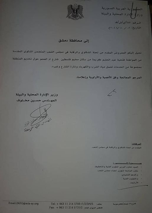 تداول ناشطون فلسطينيون شكوى محالة من وزير الإدارة المحلية إلى محافظ دمشق، تفيد أن المواطنة “فتحية عبد الحليم كريمة” قدّمت شكوى إلى “مجلس الشعب” التابع للنظام، حول تخديم المنطقة التي تسكنها في شارع أم الفحم بمخيم اليرموك بالمياه والكهرباء وإنارة الشوارع، وأوصت الإحالة إلى محافظ دمشق بمعالجة المطلوب.