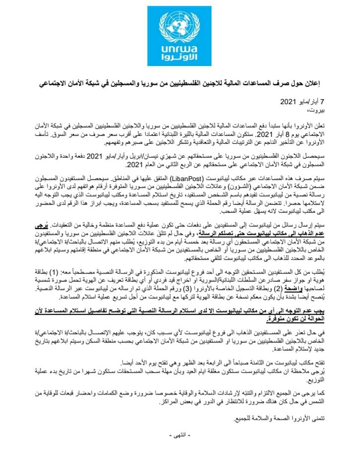 ونوهت وكالة الغوث إلى أن مكاتب ليبانبوست ستقوم بإرسال الرسائل إلى المستفيدين على دفعات حتى تكون عملية صرف المساعدات منظمة وخالية من التعقيدات، طالبة من المستفيدين عدم الذهاب إلى مكاتب ليبانبوست حتى تصلهم رسالة منها، وفي حال لم تتلق بعض العائلات من فلسطينيي سورية أي رسالة بعد خمسة أيام من بدء التوزيع أن تقوم تلك العائلات بالاتصال بالباحث أو الباحثة الاجتماعية في منطقتهم حيث سيتم ابلاغهم بالموعد المحدد للذهاب إلى مكاتب ليبانبوست لتلقي مستحقاتهم.
