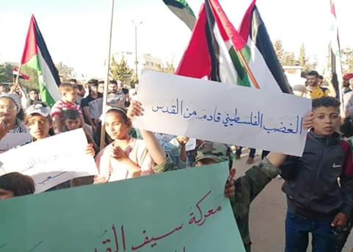 نظمت الفصائل الفلسطينية في مدينة درعا وبمشاركة أهالي المدينة ومخيم درعا مساء يوم الأحد 23 أيار/ مايو مسيرة ابتهاجاً بانتصار المقاومة الفلسطينية ونصرة لأهل فلسطين في القدس وغزة.