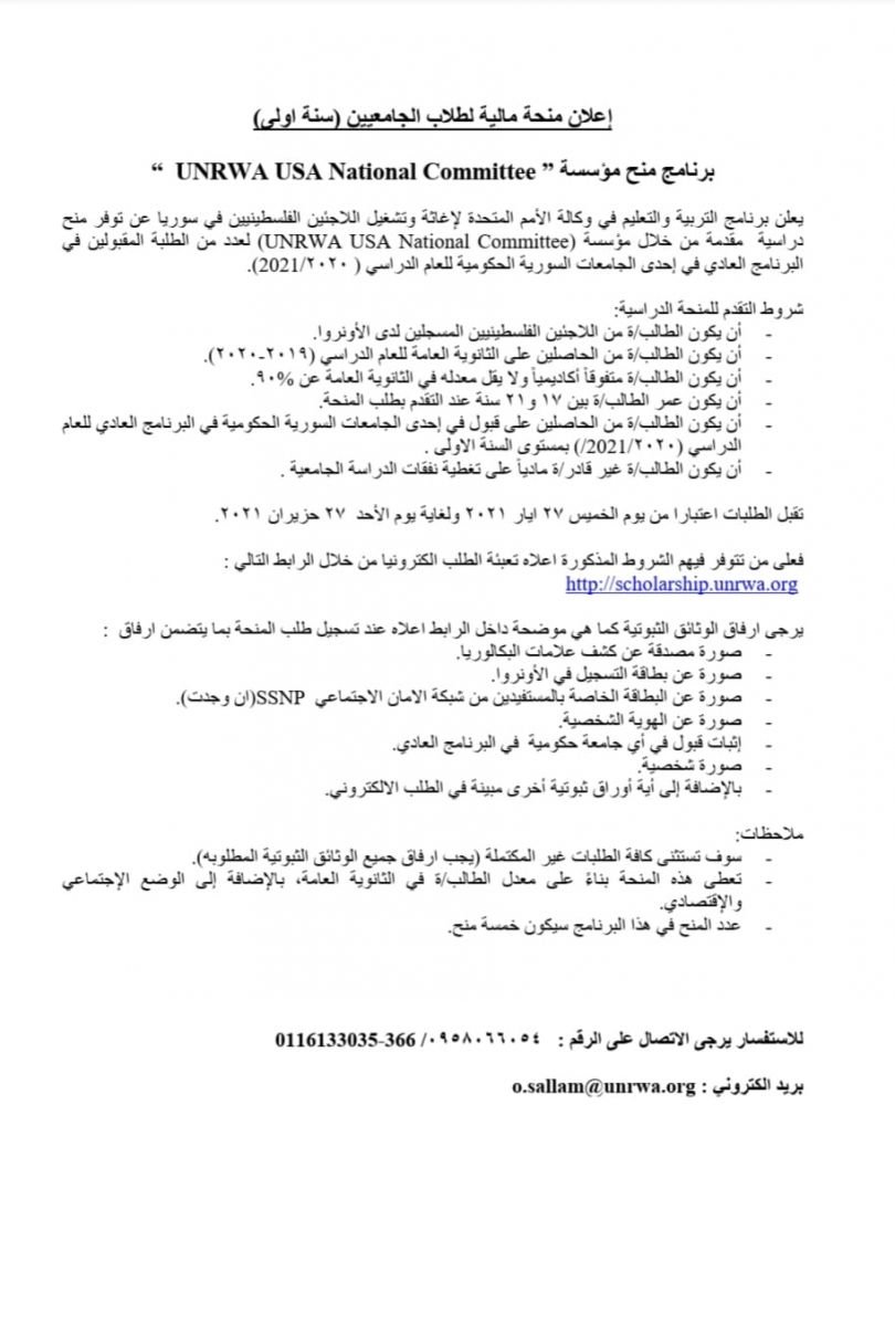 أعلن برنامج التربية والتعليم في وكالة الاونروا في سورية عن توفر منح دراسية لعدد من الطلبة المقبولين في البرنامج العادي في إحدى الجامعات السورية الحكومية للعام الدراسي 2021-2020، وهي مقدمة من خلال مؤسسة