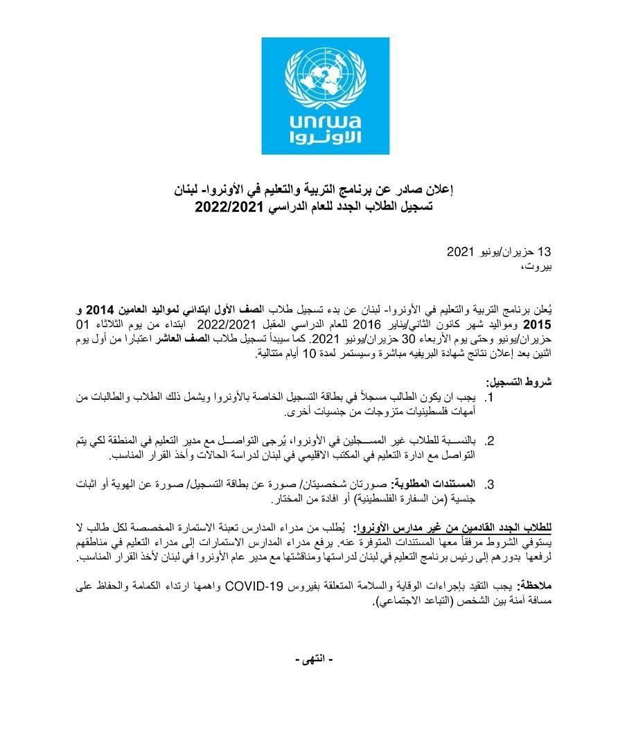 أعلن برنامج التربية والتعليم في الأونروا في لبنان عن بدء تسجيل طلاب الصف الأول الابتدائي من مواليد 2014 و2015 ومواليد كانون ثاني 2016 للعام الدراسي المقبل 2021/2022، وذلك ابتداء من 1 حزيران وحتى 30 حزيران، كما سيبدأ تسجيل طلاب الصف العاشر اعتباراً من اول يوم إثنين بعد إعلان نتائج الصف الثالث الإعدادي، وسيستمر لمدة 10 أيام، وفقاً للأونروا.
