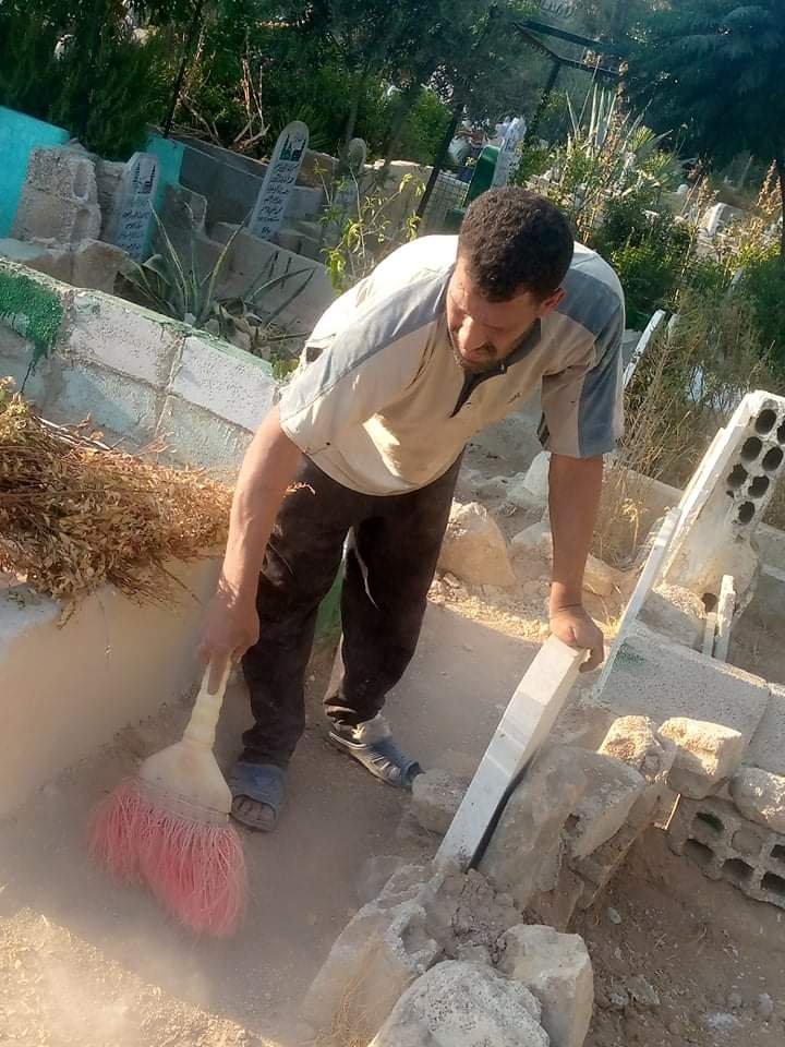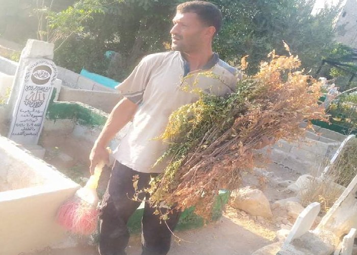 قام اللاجئ الفلسطيني “شحادة عليان” الملقب “أبو مازن” بمبادرة فردية تطوعية لتنظيف مقبرة مخيم جرمانا بريف دمشق، وذلك بهدف إزالة النفايات المتراكمة والأعشاب والحشائش والأحجار من داخل المقبرة.