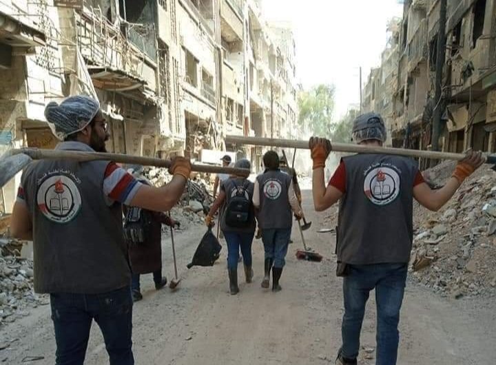 فتحت “اللجنة الشعبية لمخيم اليرموك” باب التطوع أمام الشبان والشابات للعمل على مساعدة الأهالي في تنظيف المنازل والمحال التجارية من الأنقاض.