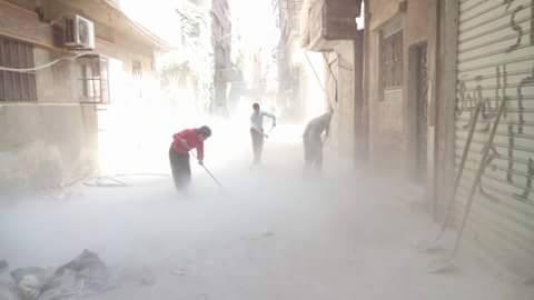 وشوهد أبناء مخيم اليرموك صباحاً بحملات تنظيف للشوارع والحارات وإزالة ركام المنازل المدمرة بعد يوم من القصف وصفه أبناء المخيم بالأعنف ، تأكيداً منهم على “استمرار حياتهم داخل المخيم رغم المحن وصعوبات العيش “حسب وصف أحد العاملين .