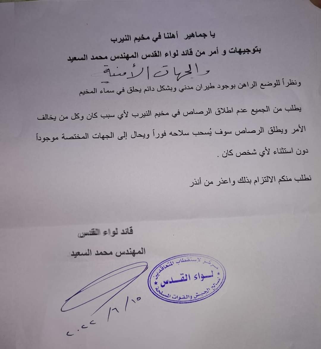 بدوره أصدر لواء القدس بياناً طالب خلاله أهالي مخيم النيرب بعدم إطلاق الرصاص لأي سبب كان، محذراً المخالفين بسحب سلاحهم فوراً واحالتهم إلى الجهات المختصة موجوداً دون استثناء لأي شخص كان، خاتماً بيانه بلهجة تهديد ووعيد للمخالفين.