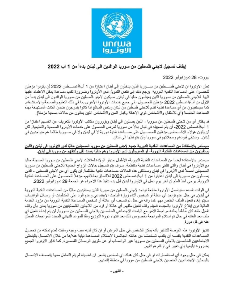 وأوضحت الأونروا أنه باستطاعة أي لاجئ فلسطيني قادم من سورية اعتباراً من 1 آب / 2022 أن يسجل في لبنان بدلاً من سورية للحصول على خدمات الأونروا الصحية والتعليمية، ولكن هؤلاء الأشخاص لن يكونوا مؤهلين للحصول على مساعدة نقدية دورية لا في لبنان ولا في سوريا، طالما هم متواجدون في لبنان، وستبقى قيدوهم وسجلاتهم في سورية ولن يتم نقلها إلى لبنان.