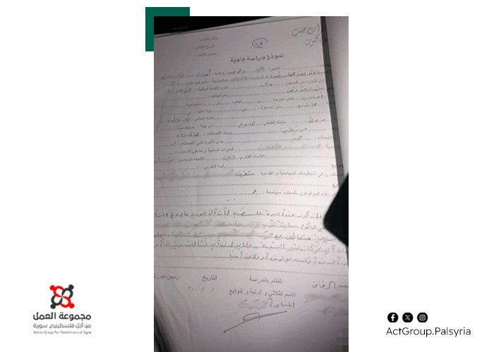 مشيراً أن أحد التقارير الأمنية الكيدية التي وصلت من مصادر خاصة إلى مجموعة العمل، كتبت باللاجئ الفلسطيني (م. ع)، من أبناء المخيم، وأن من رفع التقرير إلى فرع الأمن العسكري هما (ا. ع) و(ا. خ) من أبناء المخيم المخبرين للأجهزة الأمنية السورية.