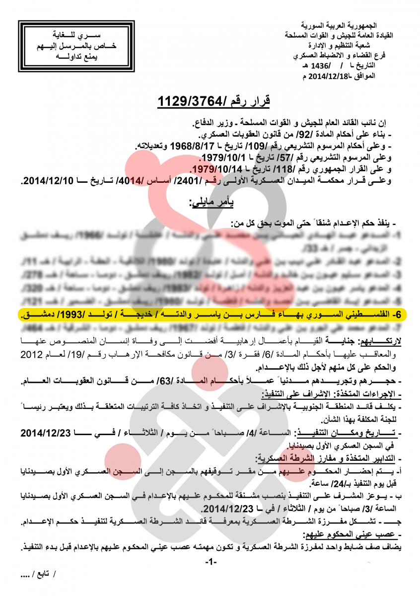في إطار سلسلة “وثائق إعدام” المستمرة، كشفت مجموعة العمل من أجل فلسطينيي سورية اليوم (الأربعاء) عن 12 وثيقة رسمية سرية جديدة تؤكد تنفيذ أجهزة الأمن التابعة للنظام السوري السابق أحكام إعدام بحق 24 لاجئاً فلسطينياً داخل سجن صيدنايا العسكري.