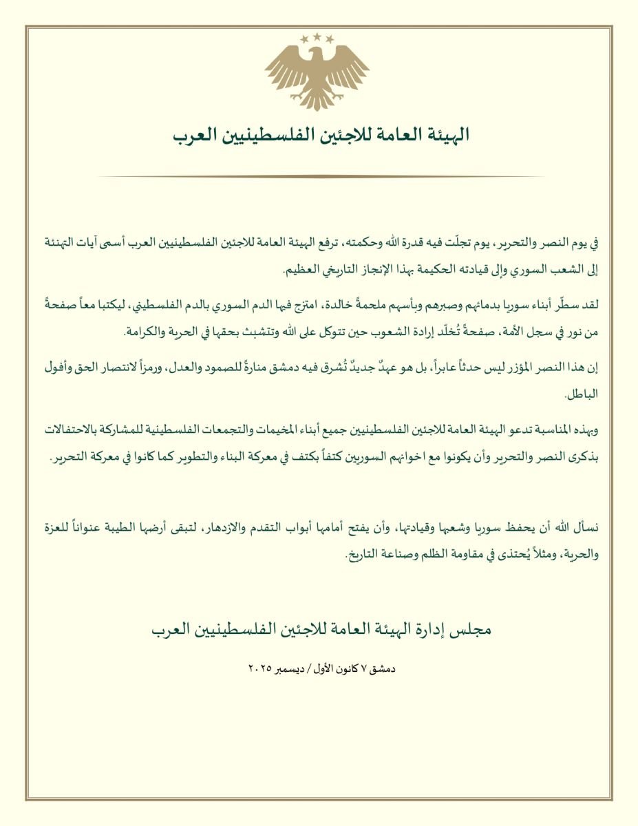 الهيئة العامة للاجئين الفلسطينيين العرب تهنئ سوريا بـ “يوم النصر”