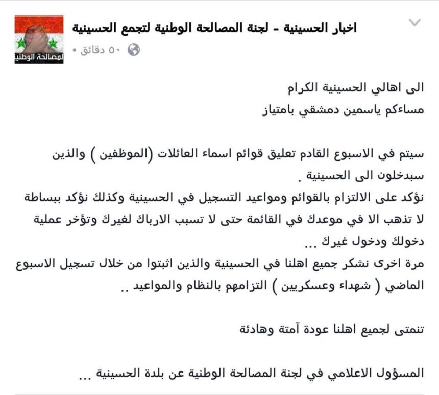 أفاد ناشطون لمجموعة العمل من أجل فلسطينيي سورية، أن من سمحت لهم حواجز الجيش النظامي بالعودة إلى مخيم الحسينية هم فقط عائلات المحسوبين عليه من عناصر في اللجان الأمنية، والحزبيين، أما بقية الأهالي لم تتم عودة أي منهم حتى الآن.