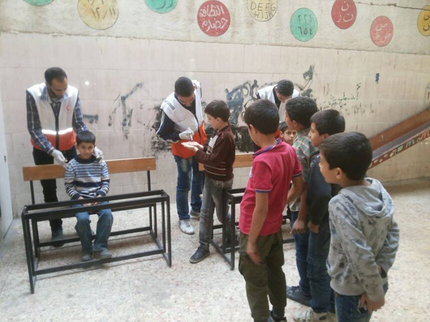قام الهلال الأحمر الفلسطيني داخل مخيم اليرموك المحاصر بحملة صحية ووقائية داخل مدارس المخيم وياض الأطفال، لتحري بعض الحالات المرضية وتوزيع المتممات على الأطفال الذين يعانون سوء التغذية، إلا أن نتائجها كانت سلبية وليس كما كان متوقعاً  بحسب أبناء المخيم، وذلك نتيجة التفاوت الكبير بين عدد إصابات الأطفال وكمية الدواء التي أُدخلت من خارج المخيم.