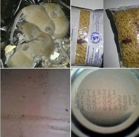 ويظهر في الصور بعض المساعدات التي تقدمها جهات دولية وهي تحتوي على حشرات، بالإضافة إلى تسوس بعضها الآخر، في حين تظهر جرذات ميتة داخل إحدى الحصص الغذائية، كما تظهر صورة أخرى إحدى المواد الإغاثية المنتهية الصلاحية.