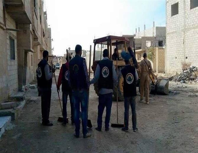 هيئة الإغاثة العالمية تستمر بإزالة الركام والأتربة من شوارع مخيم الحسينية
