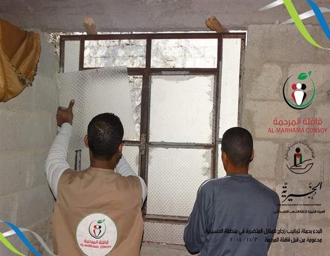 قامت ‏حملة المرحمة بالتعاون مع الهيئة الخيرية لإغاثة الشعب الفلسطيني بتركيب زجاج للبيوت المتضررة بمخيم الحسينية، ووفقاً للقائمين على الحملة فأن الفئات المستفيدة من المشروع هي (عوائل الايتام، وذوي الاحتياجات الخاصة، والعائلات  التي تعيل اكتر من 7 أفراد.