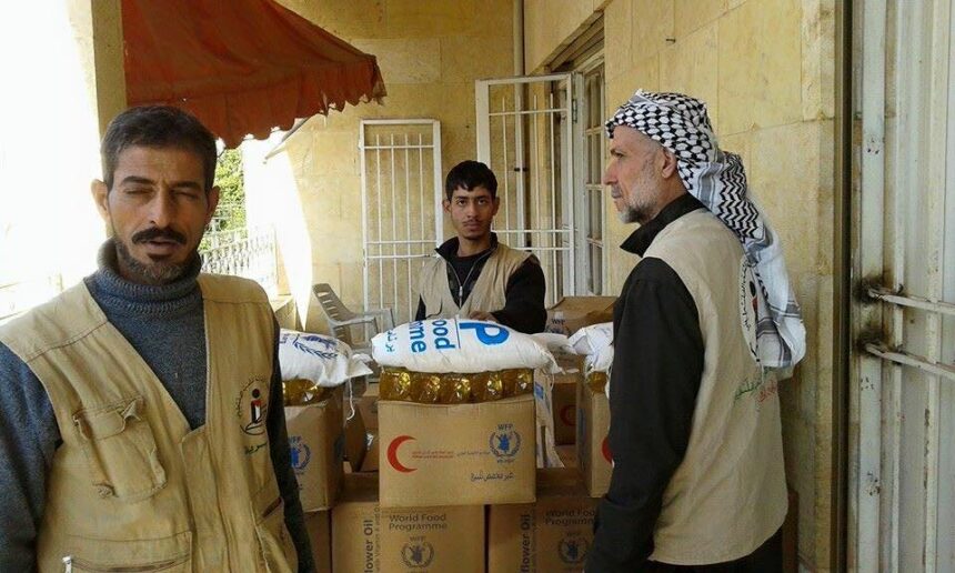 قام الهلال الأحمر الفلسطيني والهيئة الخيرية لإغاثة الشعب الفلسطيني بتوزيع بعض المساعدات الإغاثية على أهالي مخيم النيرب للاجئين الفلسطينيين بحلب.