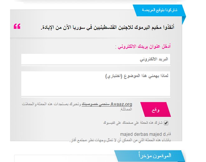 وشدد الناشطون في حملتهم التي أطلقوها على شبكة آفاز لحملات المجتمع الدولي على ضرورة التحرك لإنقاذ مخيم اليرموك، حيث يعيش آلاف العائلات ضمن مساحة 2 كيلو متر مربع تحت الحصار منذ 1033 يوم وبدون ماء منذ 583. والتحرك العاجل لإنقاذ مدنيين معرضين للإبادة داخل المخيم وبأمس الحاجة للحماية الدولية لإنقاذهم الآن وقبل فوات الأوان.
