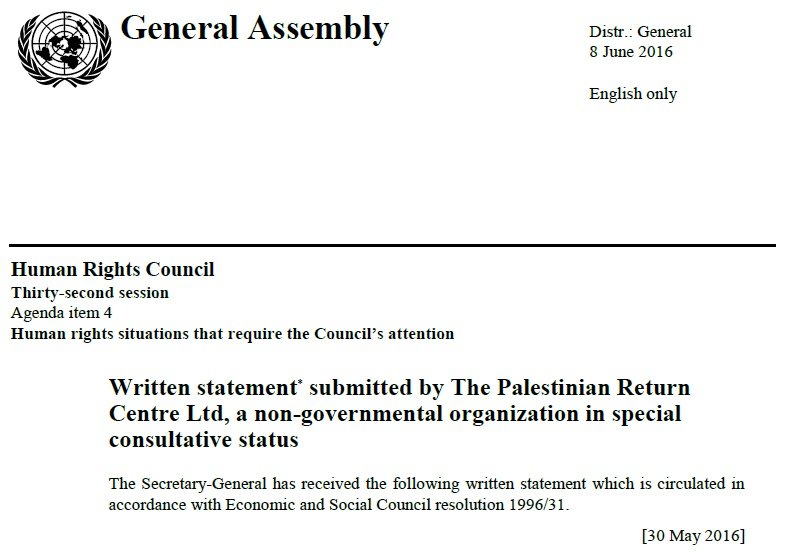 اعتمد مجلس حقوق الإنسان التابع للأمم المتحدة بياناً مكتوباً أودعه مركز العودة الفلسطيني في لندن كوثيقة من وثائق اجتماعه الدوري، حيث يتضمن البيان كافة التفاصيل المتعلقة بأكثر من (3235) ضحية فلسطينية من حيث التوزيع وأسباب الوفاة، وذلك بالاعتماد على احصائيات مجموعة العمل من أجل فلسطينيي سورية، كما يتناول التقرير معلومات عن حصار مخيم اليرموك، والأوضاع الإنسانية في باقي المخيمات الفلسطينية هناك، بالإضافة إلى المعتقلين الفلسطينيين وضحايا التعذيب الذين بلغ عددهم (445) على الأقل، كما أشار التقرير إلى الأوضاع الاقتصادية السيئة التي يعاني منها فلسطينيو سورية داخل سورية وفي البلدان التي هجروا إليها.