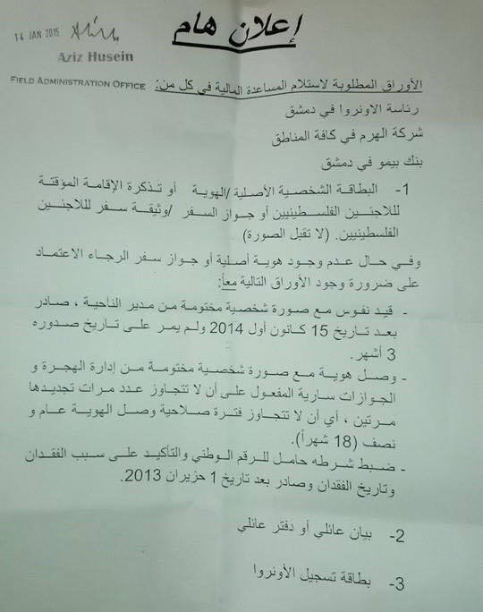 أعلنت وكالة غوث وتشغيل اللاجئين الفلسطينيين “الأونروا” عن عزمها البدء بتوزيع مساعداتها المالية على اللاجئين الفلسطينيين في مخيم النيرب بحلب.