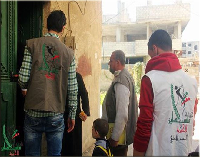 نظم فريق البحث الاجتماعي التابع لهيئة فلسطين الخيرية زيارة للعائلات الفلسطينية الفقيرة و كبار السن و الجرحى النازحة من مخيم اليرموك إلى البلدات المجاورة (يلدا – بيت سحم – ببيلا)، وذلك برفقة كادر طبي من الهيئة، حيث وزعت الهيئة خلال زيارتها مبالغ نقدية رمزية إلى تلك العائلات، فيما قام الكادر الطبي بمعاينة المرضة وعلاجهم و تقديم الأودية و العلاج اللازم لهم .