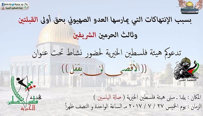 أعلنت هيئة فلسطين الخيرية في جنوب دمشق عن تنظيمها لفعالية تضامنية مع ما يتعرض له المسجد الأقصى وسكان القدس من انتهاكات على يد سلطات الاحتلال الإسرائيلي.