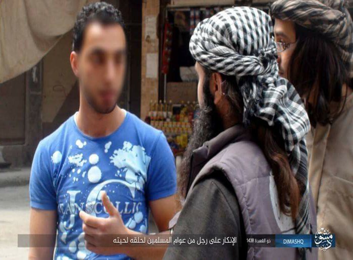 تداول ناشطون على موقع التواصل الاجتماعي (الفيس بوك) عدد من الصور تظهر عناصر من تنظيم “داعش” وهم يجلدون أحد أبناء مخيم اليرموك بحجة ارتكابه مخالفة شرعية، فيما أظهرت أحدى الصور عنصرين من التنظيم وهما يقومان بتأنيب شاب فلسطيني من أبناء المخيم لحلقه لحيته، حيث كتب على الصورة عبارة “الإنكار على رجل من عوام المسلمين لحلقه لحيته.