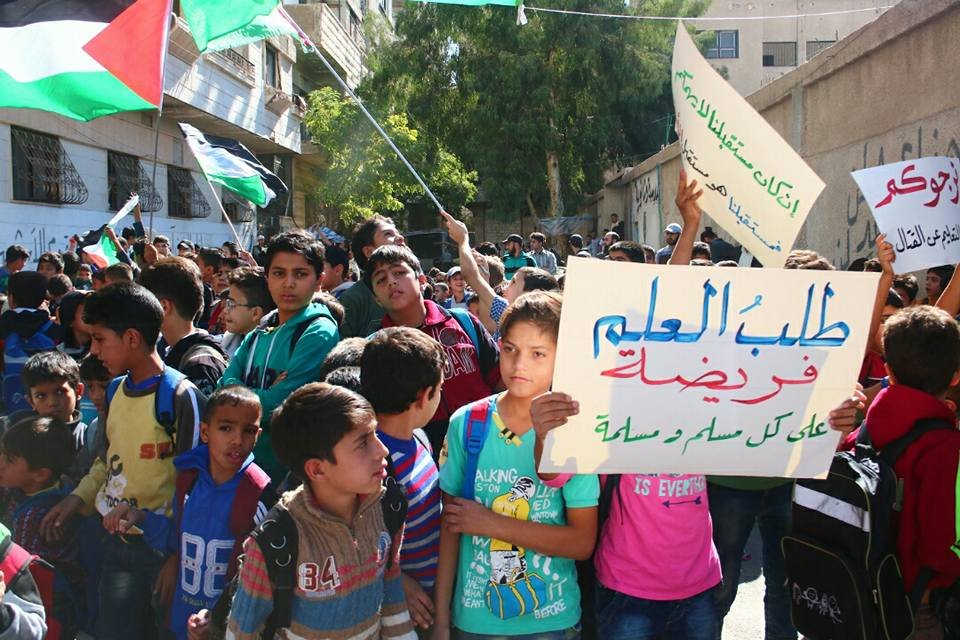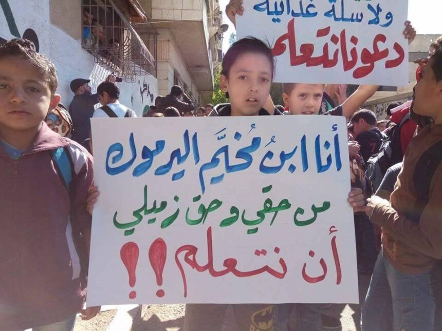 أقام طلاب مدرسة الجرمق البديلة في بلدة يلدا جنوب دمشق وقفة احتجاجية شارك فيها الكادر التدريسي، طالبوا خلالها بحقهم في التعلم وحق رفقائهم المحاصرين في مخيم اليرموك والذي يمنع اغلاق معبر المخيم من استكمال تعليمهم، كما طالبوا بعدم ربط الملفات الإنسانية بالملفات العسكرية.